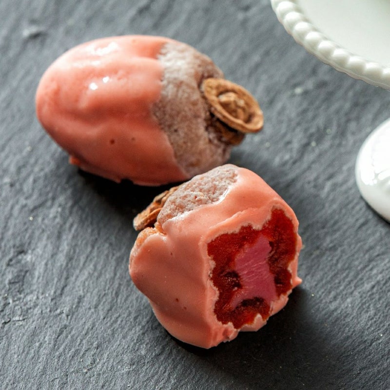 市田柿の中に甘酸っぱい木苺のガナッシュをあわせチョコレートでコーティングしました。 市田柿とショコラのとろける味わいをお楽しみください。