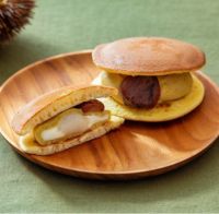 どら焼きかケーキか、和洋合わせたような雰囲気が気になり買ってみました。二種のクリームと栗に求肥まで入っていてボリュームはあるのですが、思っていたより甘さは控えめでちょうど良く、一つでいろんな味・食感が楽しめます。ゆっくり味わって頂きました。とても美味しかったです^^* お茶でもコーヒーでもあうと思います。